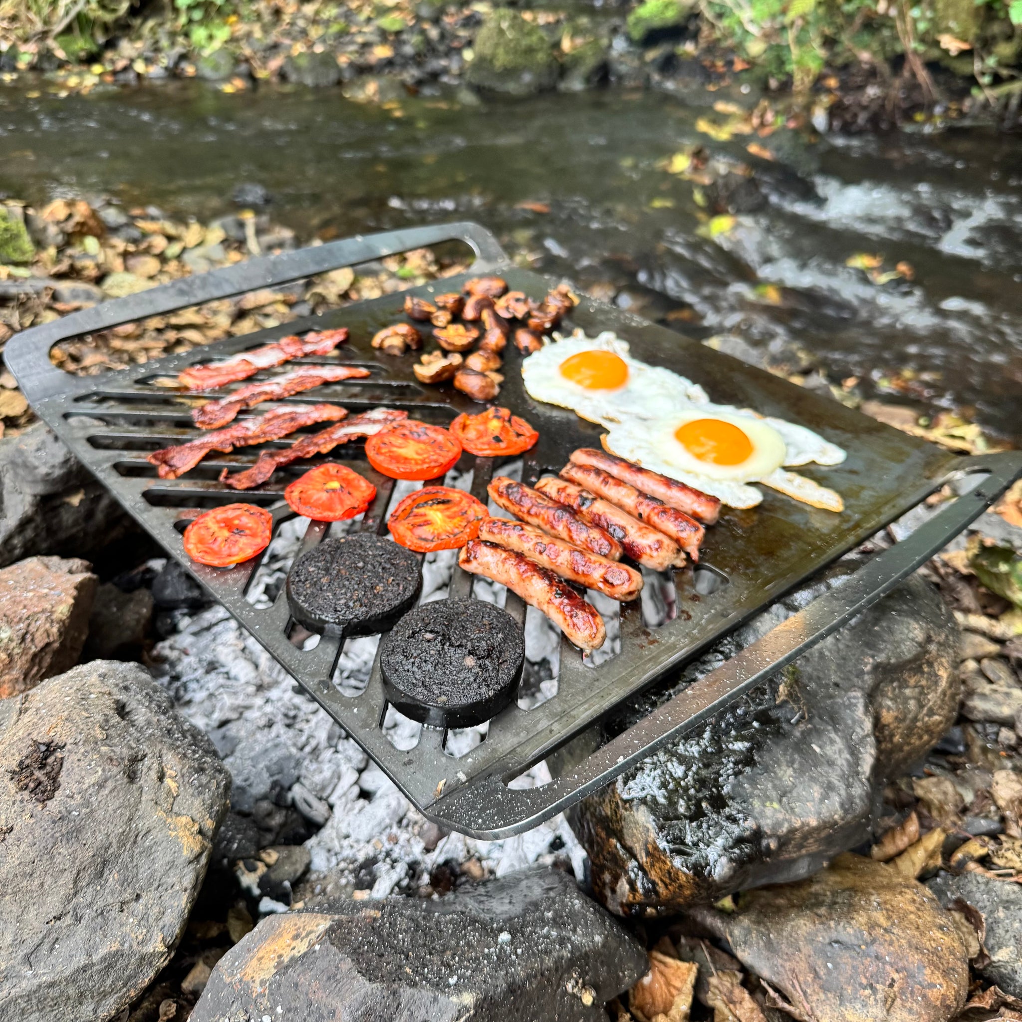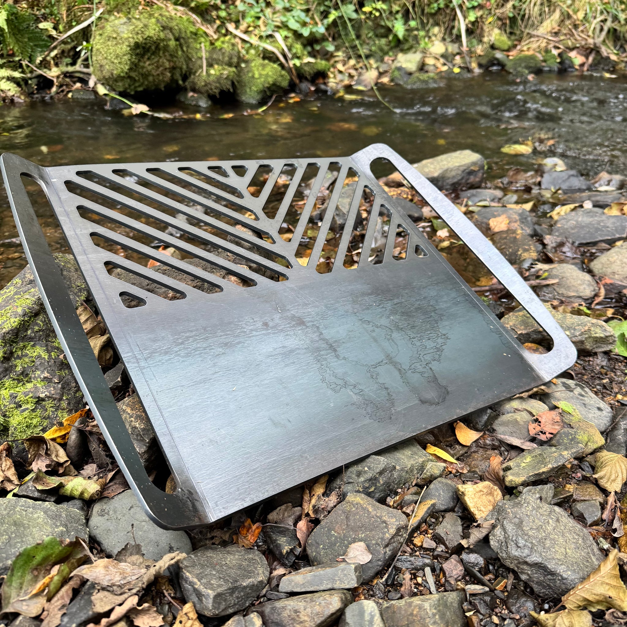 The Willdwood is an all in one grill plate made from heavy duty carbon steel. Designed for cooking in the wild, whether it's out in a woodland camp or down on the beach. One side is a solid griddle plate, the other a slotted grill giving loads of cooking options.